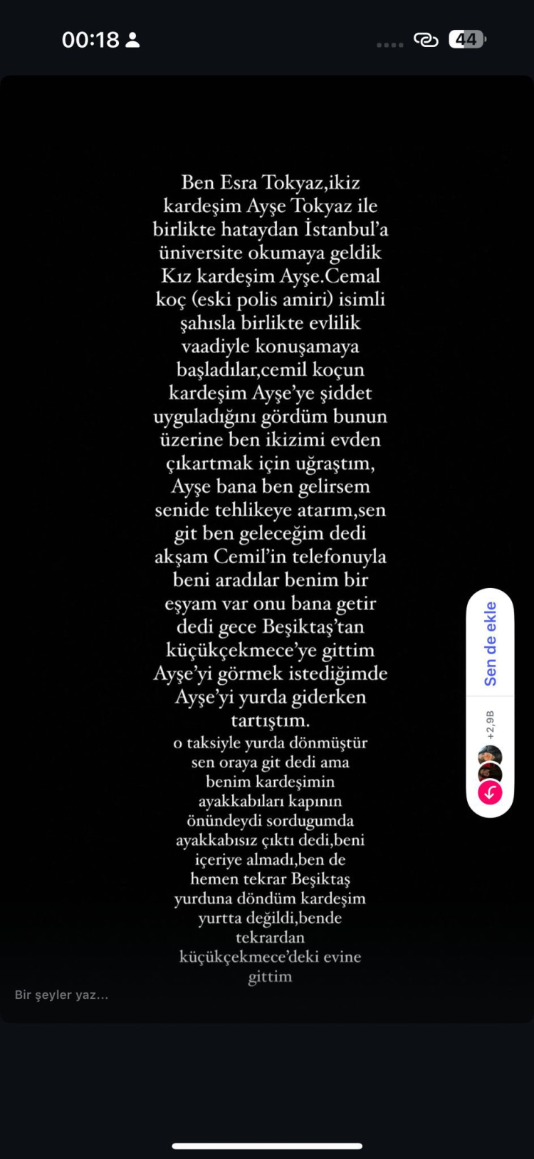 Kız kardeşinin katil zanlısıyla 5 ay önce evlilik vaadiyle tanıştığını söyleyen ikiz kız kardeşi Esra Tokyaz, "Ayşe Tokyaz, benim tek yumurta ikizimdi. Biz Hatay'dan İstanbul'a üniversite okumaya gittik. Hemşirelik bölümü son sınıf öğrencisiyiz. Kız kardeşim, C.K. ile 5 ay önce evlilik vaadiyle birbirleriyle tanıştılar. C.K. kız kardeşimi kaçırdı, ben de bunu fark ettim. Kardeşimde morlukları görünce aynı günü gittim ve polisleri çağırdım. Sonra C.K. beni görüntülü aradı. Bende ona kardeşimin yerini söyle diyordum ama bana söylemiyordu. Ben de ona kardeşimi bırakmasını sonrada istediğini yapmasını söyledim. Kardeşimi bir yerde bıraktığını söylemişti ve de kardeşimin cesedini bir yere bıraktı. Adli Tıp Kurumuna gittim, üzüntüden başımı duvarlara vuruyorum. Sonra uzun süre sonra kız kardeşimin cenazesini aldım ve Hatay'a getirdim" dedi.