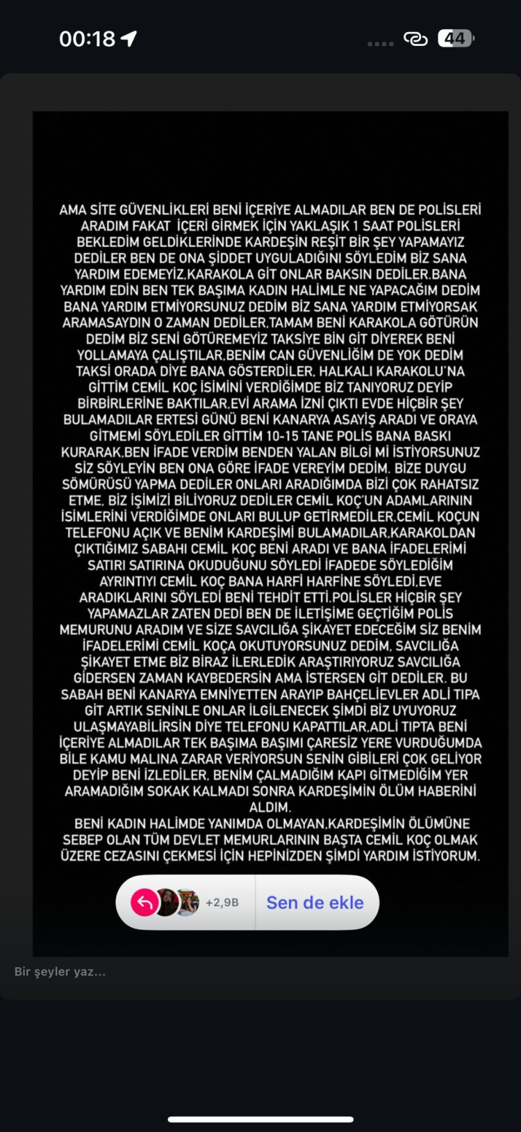 İkiz kız kardeşinin tanınamayacak halde olduğunu ve kimseye cansız bedenini göstermediğini ifade eden Esra Tokyaz, "Ben kardeşimi en son çarşamba günü Mecidiyeköy'de gördüm. Ondan sonra görmedim ama sesini duydum. Sesini duyduğum gün zaten onun yanına gittim. Yanına gittiğimde işte eşyası vardı. Bana onu getir dedi ve eşyalarını götürdüm. C.K. kapıyı açtı ve ‘kardeşin burada değil' dedi. Ama kardeşimin ayakkabıları kapının önündeydi. Ayşe mutlu olmak istiyordu. C.K. onu çok sevdiğini ve değer verdiğini hissettiriyordu. Kardeşim bana C.K.'nın kendisine gelinlik ve yüzük fotoğrafları attığını, çocuğum olursa şu ismi koyacağız diye aralarında konuştuklarını anlatıyordu. Benim kardeşimle evlilik vaadiyle kandırıp konuşmaya başladı. Benim kardeşim de onun güzel sözlerine kapıldı. Bugün de defin işlemi yapıldı. Hatay'a bugün ben kardeşimi getirdim. Kardeşimi kimseye göstermedim, görünmeyecek haldeydi. Tek ben gördüm o halini. Kimseye yaklaşmak istemedim. Annemi bile yaklaştırmadım ve sadece önlerinde durdum. Ben şu an güçlü olmak zorundayım, benden başka kimse yok. Ben adli tıptayken ben tek başıma bir şeyleri halledemeyeceğimi anladığım için aileme haber verdim. Onlar da yanıma geldiler. Beraber kardeşimi getirdik ve gerekeni yaptık. Şimdi kardeşimin biz acısını hissetmiyoruz. Biz önce adaleti arıyoruz. Ondan sonra acımızı çekeceğiz ve adalet istiyorum" ifadelerini kullandı.