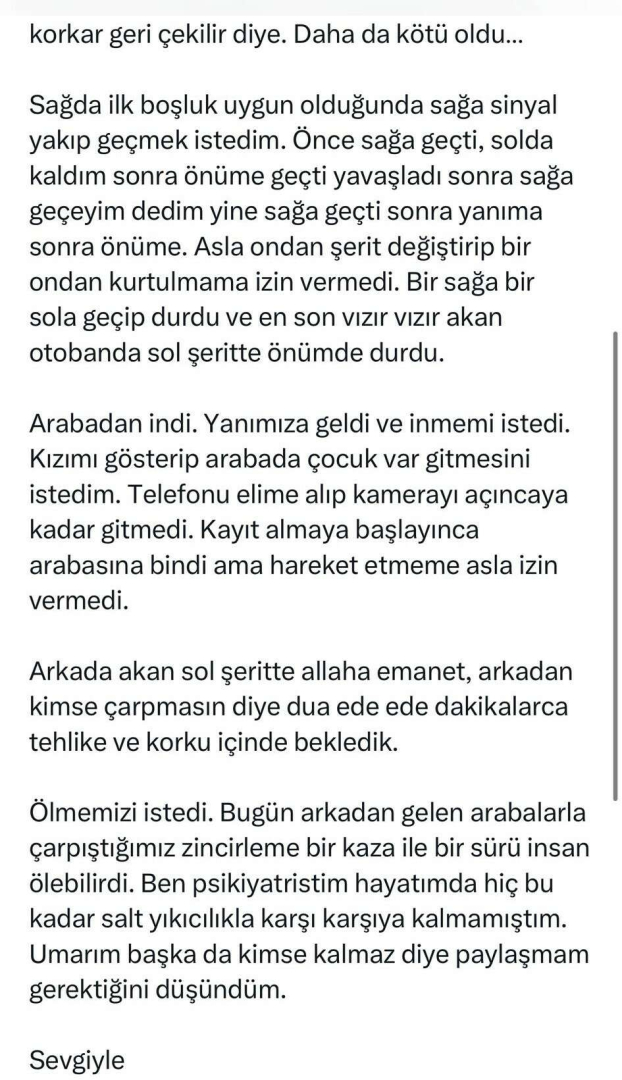 Psikiyatrist, sosyal medyadaki paylaşımında, "Bugün sözlü tartışmaya bile girmeden arabada bekleyen iki kadın bir çocuk üç insan kendilerinin ölmesini isteyen bir adamı nasıl çaresizce izledi paylaşmak istedim. TEM Hadımköy ile Avcılar arasında arabamla orta şeritte yaklaşık 100km/s hız ile ilerlerken, arkamı da kontrol edip sinyalimi yakıp sola geçtim. Arkadaki aramızda oldukça uzak mesafe olan araba benim sola geçtiğini görünce uzunları yakıp iyice hızlandı ve yaklaşıp arka tamponuma değe değe beni sıkıştırmaya başladı. Sağ şerit dolu geçemiyorum, hızlanıyorum ki hızım 120km/s civarında o da hızlanıyor asla takip mesafesini açmıyor. Kurtulmam için 150km/s e çıkmam çare olurdu belki, onu da yapmadım. O dokundura dokundura gelmeye devam ederken biz de telefonu alıp dikiz aynasından fotoğrafını çeker gibi yaptık belki bir korkar geri çekilir diye. Daha da kötü oldu...” ifadelerini kullandı.