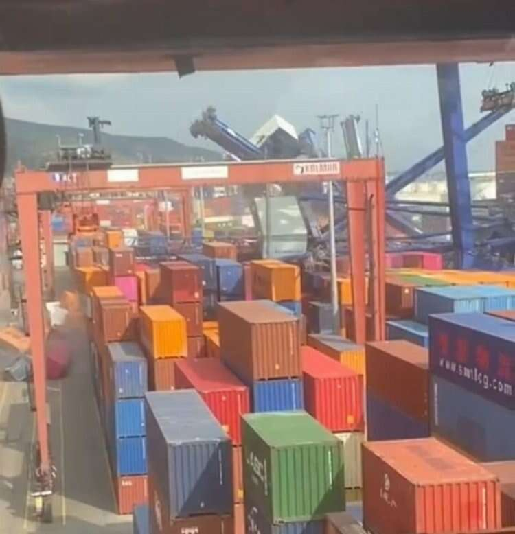 Kocaeli'nin Körfez ilçesinde bulunan Evyapport limanında gemi kıyıda bulunan vinçlere çarptı. Devasa vinçler, limanın üzerine devrildi, dehşet anları kameralar tarafından görüntülendi.