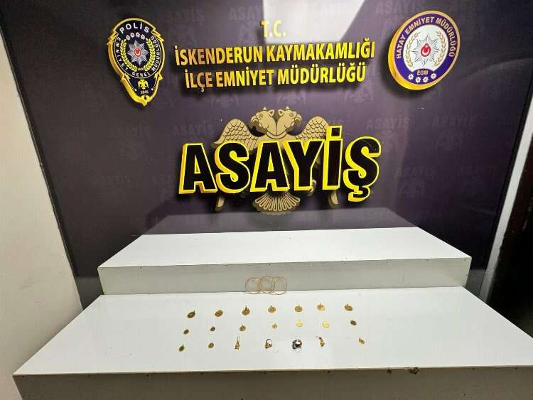 Hatay Emniyet Müdürlüğü ekipleri, hırsızlık suçlarına yönelik asayiş çalışmalarına devam ediyor. Bu çerçevede İskenderun ilçesi Pirireis Mahallesi’nde 9 Ocak tarihinde hırsızlık olayı meydana geldi. Olayla ilgili yapılan çalışmalar sonucunda; komşusunun ziynet eşyalarını çaldığı tespit edilen şüpheli M.D., 12 Ocak tarihinde yakalanarak gözaltına alındı. Olayla ilgili polis ekiplerinin yaptığı aramada; 3 burma bilezik altın, 7 tam altın, 1 kapalı tam ata altını, 3 yarım altın, 6 çeyrek altın, 1 kadın yüzük, 1 çift altın kadın küpe ve 1 koyu renkli erkek yüzük ele geçirildi.