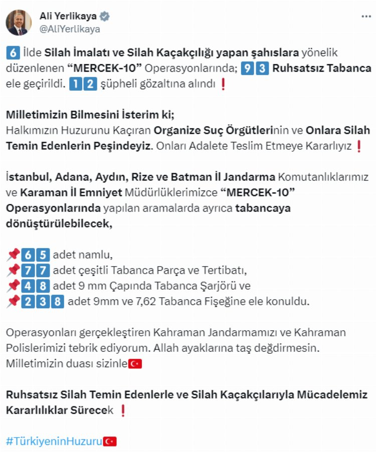 Yerlikaya paylaşımda, ruhsatsız silah temin edenlerle ve silah kaçakçılarıyla mücadelenin kararlılıkla süreceğini belirtti.