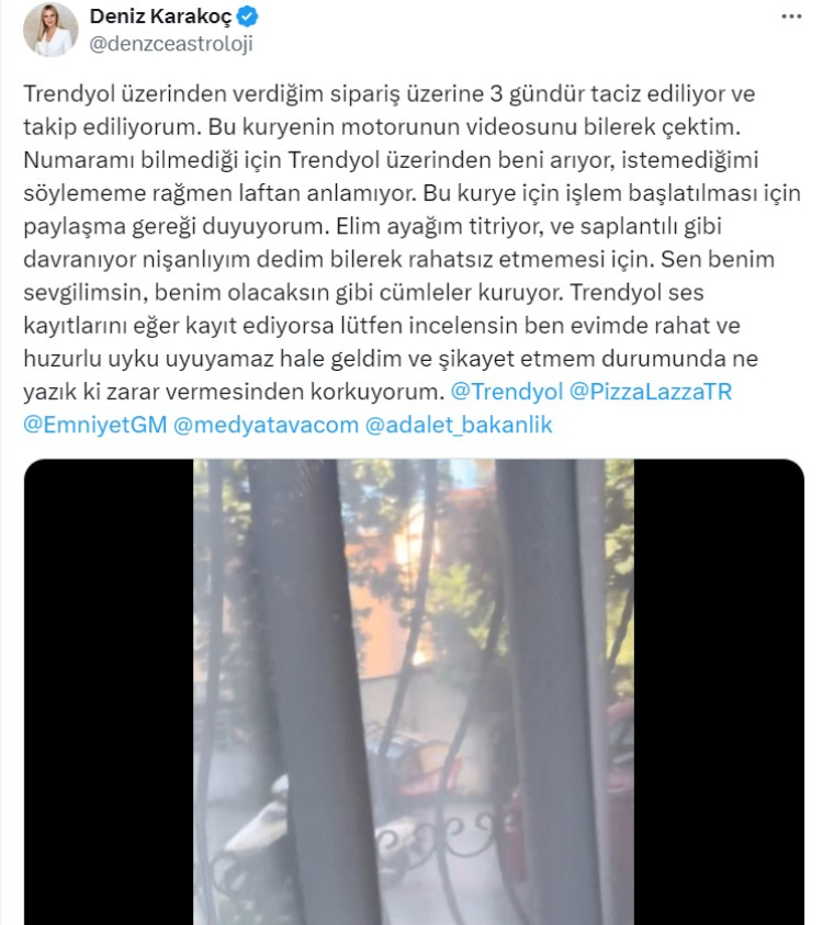 İstanbul’da 26 yaşındaki astrolog Deniz Karakoç, internetten verdiği pizza siparişi sonrasında büyük bir kâbus yaşadı. Karakoç’un siparişini getiren motosikletli kurye, evine teslimat sırasında telefonla arayarak rahatsız edici davranışlarda bulundu.