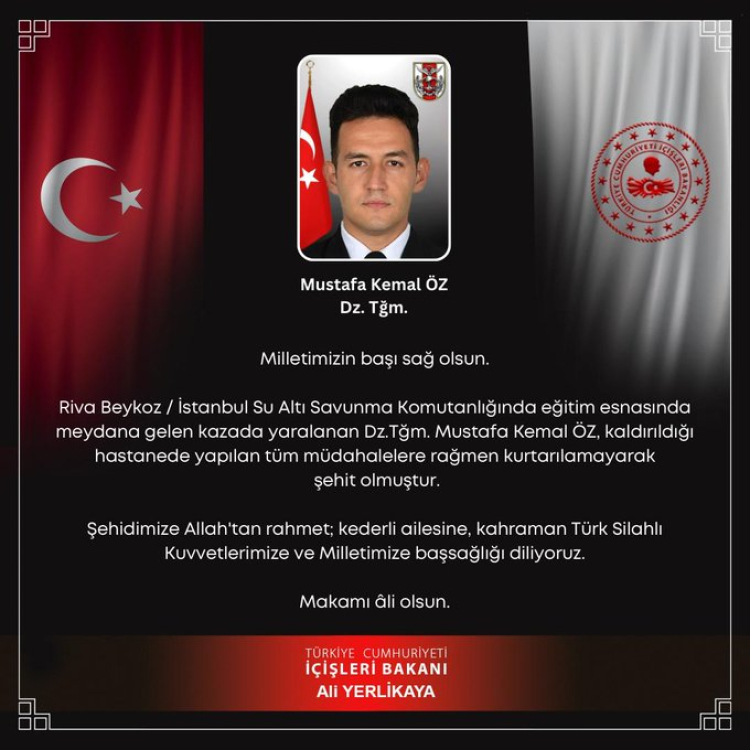 Milli Savunma Bakanlığı, Riva Beykoz'daki İstanbul Su Altı Savunma Komutanlığı'nda eğitim sırasında meydana gelen kaza sonucunda yaralanan Deniz Teğmen Mustafa Kemal Öz’ün hastanede şehit olduğunu duyurdu.