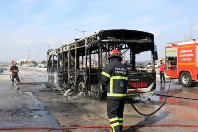Sakarya'nın Adapazarı ilçesinde duble yolda belediye otobüsü alev topuna döndü. Aracın alev alev yandığı anlar cep telefonu kamerası ile saniye saniye kaydedildi. Yolcuların tahliye edildiği araçtan geriye demir yığını kaldı.