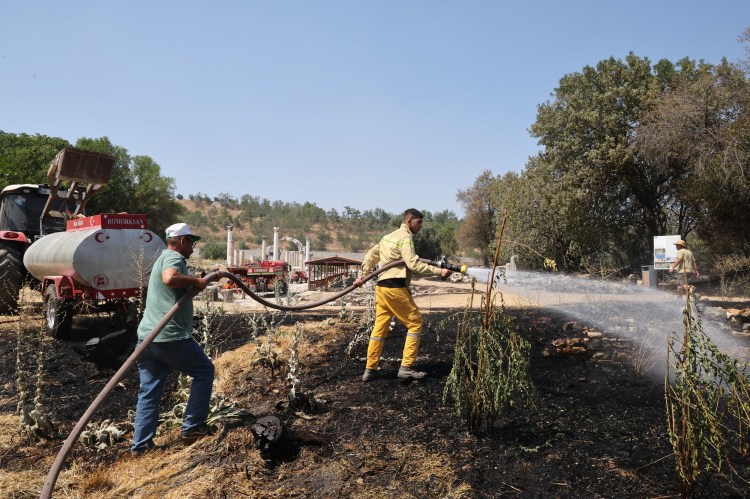 Muğla Yatağan’daki Stratonikeia antik kent çevresinde çıkan otluk yangını, yüzlerce yıllık meyve ağaçlarına zarar verdi. Havadan ve karadan müdahalelerle yangın kontrol altına alındı.