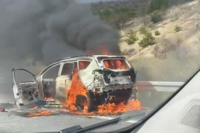 Bolu'da TEM Otoyolu'nda seyir halindeki bir cip, motor bölümünden dumanlar yükselerek bir anda alev aldı. Aracın alev topuna dönmesiyle büyük maddi hasar meydana gelirken, yangın anı cep telefonlarıyla kaydedildi.
