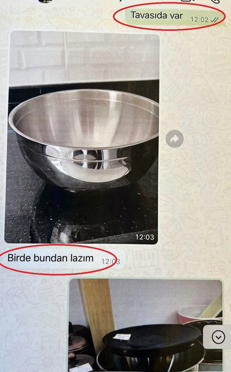 Köse’nin iddialarına göre A.A., ödeme yapılabilmesi için önce Köse’nin avukatını değiştirmesini istedi. Ardından ise WhatsApp üzerinden tencere, tava, tabak ve granit mutfak eşyası siparişleri göndermeye başladı. Bazı yazışmalarda A.A.’nın santimetre ölçüsü vererek tencere derinliğini bile belirttiği görüldü.