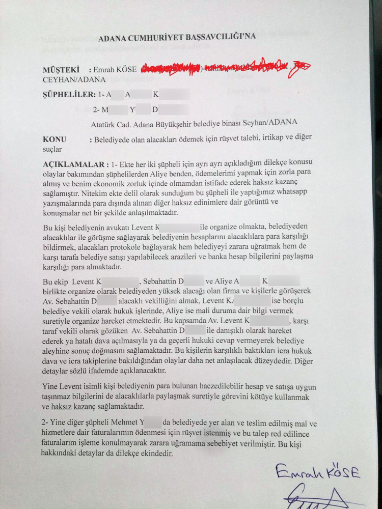 Müteahhit Emrah Köse, A.A. ile yaptığı tüm WhatsApp konuşmalarını tek tek dosya haline getirerek Adana Adliyesi’ne başvurdu. Savcılığa suç duyurusunda bulunan Köse, ardından Adana Emniyet Müdürlüğü Kaçakçılık ve Organize Suçlarla Mücadele (KOM) Şubesi’ne giderek ifade verdi.