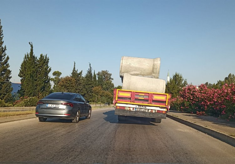 Bugün Adana'da römork plakası 33 AKZ 403 olan bir tırla tonlarca ağırlığındaki beton boruların gerekli bağlama önlemi alınmadan taşınması, trafikte büyük bir tehlike oluşturdu.