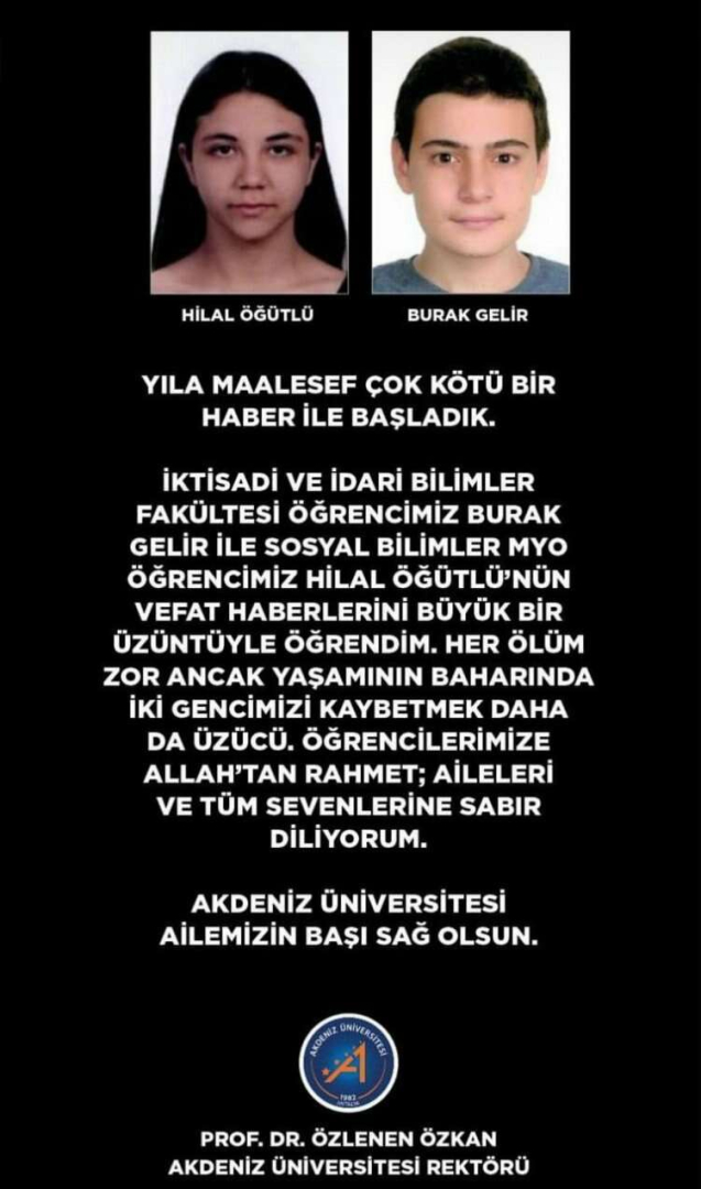 Üzücü olay karşısında bir paylaşım yapan Akdeniz Üniversitesi Rektörü Özlenen Özkan, “Yıla maalesef çok kötü bir haber ile başladık. İktisadi ve İdari Bilimler Fakültesi öğrencimiz Burak Gelir ile Sosyal Bilimler MYO öğrencimiz Hilal Öğütlü'nün vefat haberlerini büyük bir üzüntüyle öğrendim. Her ölüm zor ancak yaşamının baharında iki gencimizi kaybetmek daha da üzücü. Öğrencilerimize Allah'tan rahmet, aileleri ve tüm sevenlerine sabır diliyorum. Akdeniz Üniversitesi ailemizin başı sağ olsun” ifadelerine yer verdi.