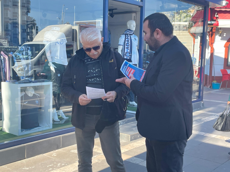 Adana’da SES’e bağlı sağlık çalışanları, 6-10 Ocak tarihleri arasında iş bırakacaklarını duyuran aile hekimlerinin neden eylemde olduklarını vatandaşlara anlatmak amacıyla Duygu Kafe önünde bilgilendirme broşürleri dağıttı.