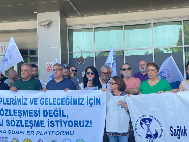 Adana’da sağlık çalışanları, 1 Ağustos’ta başlayacak Kamu Görevlileri Toplu Sözleşme görüşmeleri öncesinde Seyhan Devlet Hastanesi önünde bir araya gelerek basın açıklaması gerçekleştirdi. SES Adana Şube Başkanı Şükran Güzel, yaptığı basın açıklamasında, maaşların enflasyon karşısında hızla eridiğine ve satın alma gücünün her geçen gün azaldığına dikkat çekerek, “Maaşlarımız enflasyon karşısında buharlaşıyor. Yaşadığımız gerçek enflasyon ve hayat pahalılığı ile ezildikçe eziliyoruz” dedi.