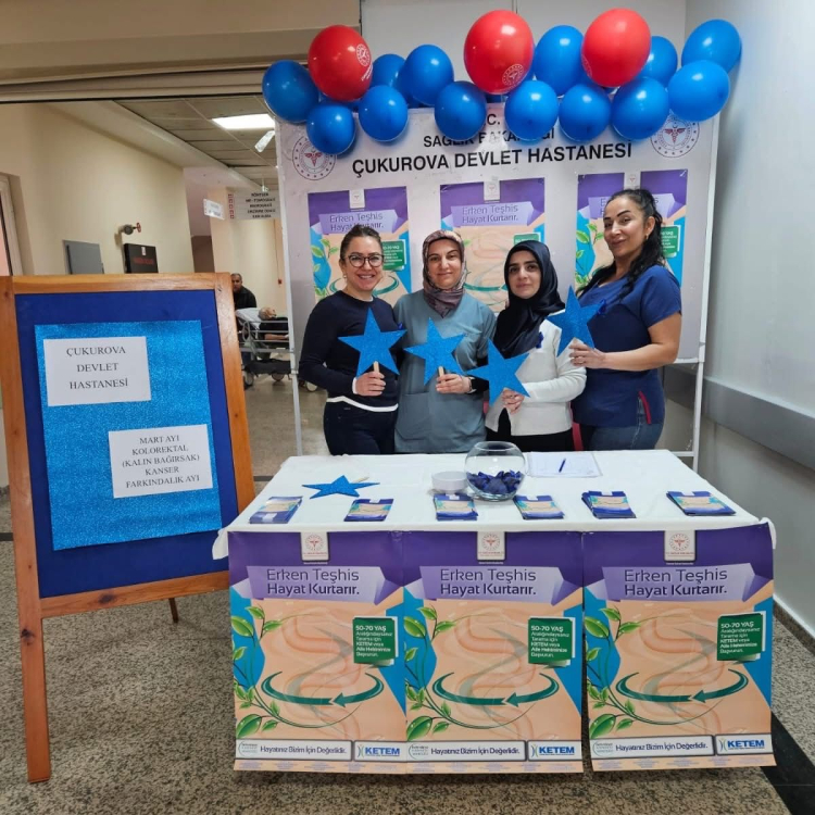 Çukurova Devlet Hastanesi’nde Kolon Kanseri Farkındalık Ayı kapsamında düzenlenen stant çalışmasında vatandaşlara erken tanı, tarama testleri ve sağlıklı yaşam hakkında bilgilendirme yapıldı.