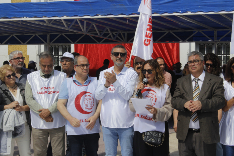 Genel Sağlık-İş Adana Şube Başkanı Hatice Erdoğan, “İnsanca yaşamak ve onurlu çalışma koşullarına kavuşmak için verdiğimiz mücadele, bir 14 Mart Tıp Bayramı’nda daha devam ediyor! 14 Mart 1919'da Hikmet Boran öncülüğünde tıbbiyelilerin İstanbul’u işgal eden kuvvetlere karşı bağımsızlık bayrağını açtığı o tarihi ruh, bugün sağlık emekçileri tarafından daha güçlü bir şekilde taşınmaktadır. Ancak o gün vatani için ayağa kalkan sağlık emekçileri, bugün kendi meslek onurunu, emeğini ve yasam hakkini savunmak zorunda bırakılmıştır” diye ifade etti.