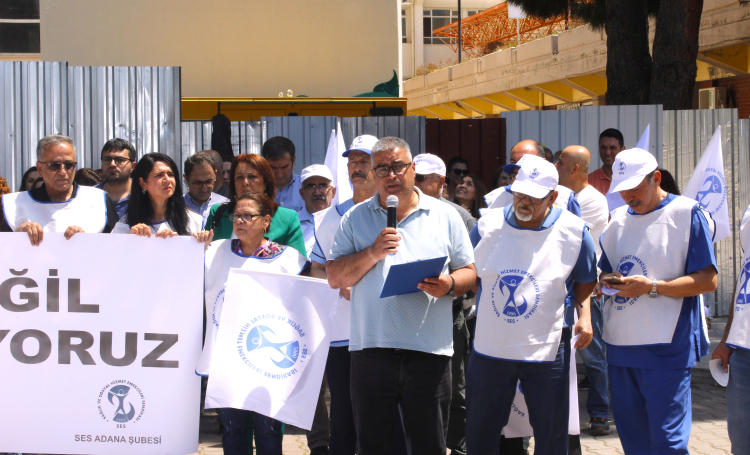 Genel Sağlık-iş Adana Şube Başkanı Hatice Erdoğan Çukurova Üniversitesi'ne bağlı sağlık emekçilerinin zor çalışma koşulları altında, yoksulluk sınırının altında ücretler aldığını ve uzun nöbetlerle mücadele ettiğini ifade ederek şunları söyledi: “Akdeniz Bölgesinin bilim ve sağlık alanlarında taşıyıcı kolonlarından olan Çukurova Üniversitesi, emek düşmanı uygulamalarla içten içe çürütülmektedir. Üniversiteye bağlı sağlık emekçileri, yoksulluk sınırının altında ücretler alarak, yetersiz istihdam nedeniyle insanüstü bir iş yükü ile boğuşarak, uzun nöbetlere ve özlük haklarını yıpratmaya yönelik şartlara maruz kalarak emek vermektedir.”