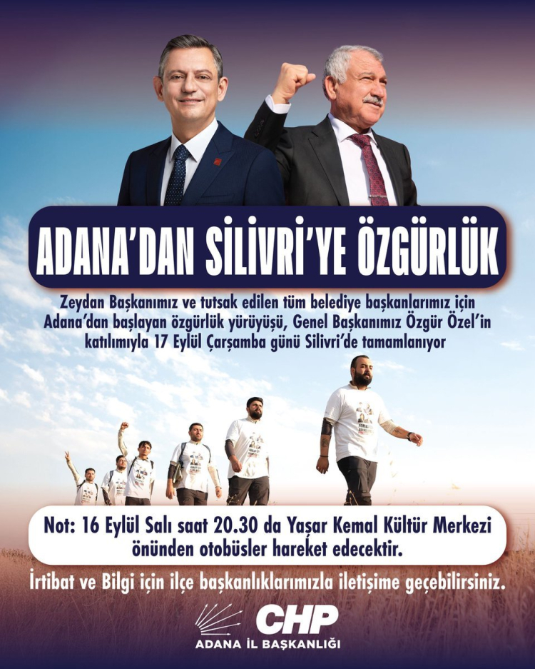 Cumhuriyet Halk Partisi (CHP) Adana İl Başkanlığı, tutuklanan belediye başkanları Zeydan Karalar, Oya Tekin ve Kadir Aydar için gençlerin başlattığı yürüyüşü 17 Eylül Çarşamba günü Silivri’de karşılamak üzere 16 Eylül Salı günü otobüslerle yola çıkacaklarını duyurdu. Açıklamada, yürüyüşe katılmak isteyen vatandaşların bulundukları ilçelerdeki CHP ilçe başkanlıklarıyla iletişime geçebileceği belirtildi.