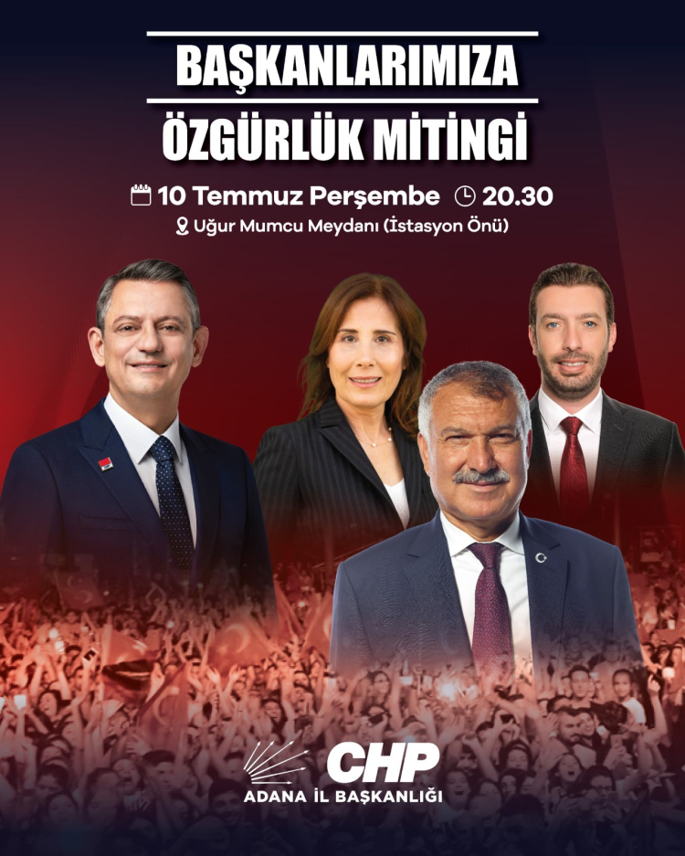 CHP Genel Başkanı Özgür Özel, 10 Temmuz Perşembe günü Adana’da düzenlenecek “Zeydan Karalar, Oya Tekin ve Kadir Aydar’a Özgürlük Mitingi”ne katılacak.