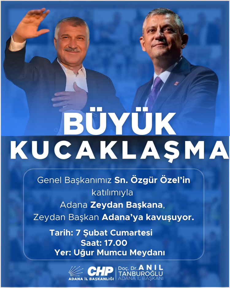 CHP Genel Başkanı Özgür Özel ile Adana Büyükşehir Belediye Başkanı Zeydan Karalar, “Büyük Kucaklaşma” adıyla düzenlenecek miting kapsamında yarın Adana’da vatandaşlarla bir araya gelecek.