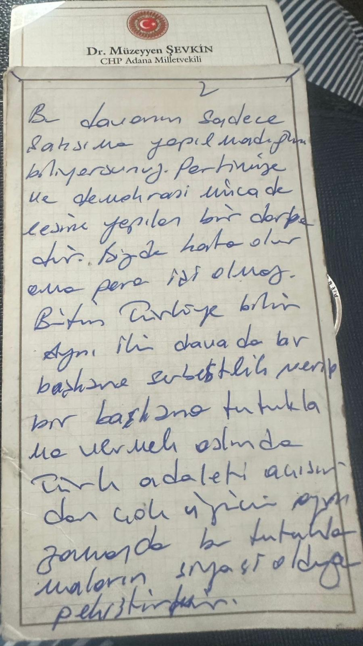 Milletvekillerinin ziyaretinde yazılı mesaj veren Başkan Zeydan Karalar, şunları kaydetti: "Adanalı kardeşlerim, canlarım. Sizlerin beni ne kadar sevdiğinizi ve güvendiğinizi biliyorum. Benim de size karşı hissettiklerim aynı. Milletvekillerimiz Müzeyyen Şevkin, Ayhan Barut, Orhan Sümer ve Aysu Bankoğlu ziyaretime geldiler. Kardeşlerim gözaltından bu yana buradalar. Bu davanın sadece şahsıma yapılmadığını biliyorsunuz. Partimize ve demokrasi mücadelesine yapılan bir darbedir. Biz de hata olur ama para işi olmaz. Bütün Türkiye bilir. Aynı iki davada bir başkasına serbestlik verip bir başkasına tutuklama vermek aslında Türk adaleti açısından çok üzücü. Aynı zamanda bu tutuklamaların siyasi olduğunu pekiştirir. Arkadaşlar da gördüler ki, ben iyiyim. Neden buradayım, iyi biliyorum. Kardeşiniz her zamanki gibi dik duruşunu asla bozmaz ve taviz vermez. Mücadeleye devam. Hepinizi çok seviyor, hasretle kucaklıyorum."