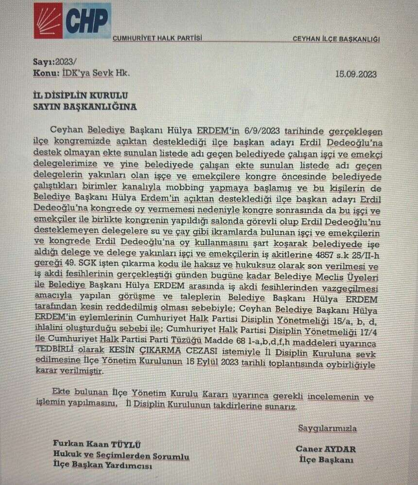 Ceyhan Belediye Başkanı Hülya Erdem’in desteklediği aday seçimi kazanamayınca 39 kişiyi işten çıkarmasının ardından parti içinde alınan kararla belediye başkanı, "kesin çıkarma cezası" istemiyle il disiplin kuruluna sevk edildi.
