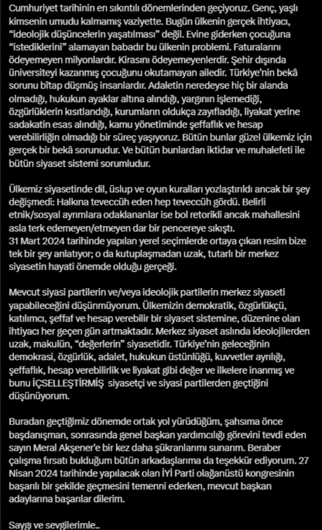 İYİ Parti Genel Başkan Yardımcısı Birol Aydemir, sosyal medya platformu X üzerinden yaptığı paylaşımla, İYİ Parti’deki görevlerinden ve partiden istifa ettiğini duyurdu. Yaptığı paylaşımda mevcut siyasi partilerin ve ideolojik partilerin merkez siyaseti yapabileceğini düşünmediğini belirten Aydemir, “Buradan geçtiğimiz dönemde ortak yol yürüdüğüm, şahsıma önce başdanışman, sonrasında genel başkan yardımcılığı görevini tevdi eden Sayın Meral Akşener'e bir kez daha şükranlarımı sunarım. Beraber çalışma fırsatı bulduğum bütün arkadaşlarıma da teşekkür ediyorum. 27 Nisan 2024 tarihinde yapılacak olan İYİ Parti Olağanüstü Kongresi'nin başarılı bir şekilde geçmesini temenni ederken, mevcut başkan adaylarına başarılar dilerim” ifadelerini kullandı.