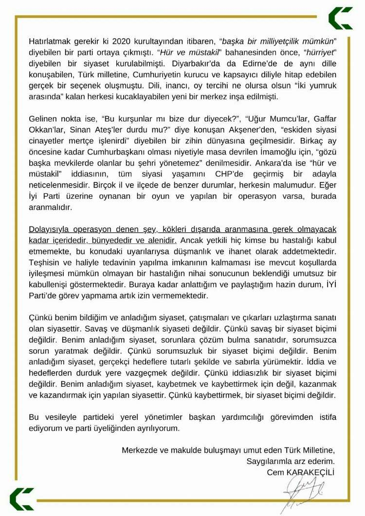 İYİ Parti Genel Başkan Yardımcısı Cem Karakeçili, sosyal medya üzerinden istifasını duyurdu