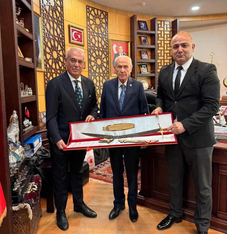 MHP Adana İl Başkanı Yusuf Kanlı, beraberinde MHP Seyhan İlçe Başkanı Hakan Yıldırım ile birlikte MHP Genel Başkanı Devlet Bahçeli’yi genel merkezde ziyaret etti. Ziyarette, Adana teşkilatları, belediyeleri ve bağlı sivil toplum kuruluşlarının yürüttüğü çalışmalar hakkında kapsamlı bilgi sunan Kanlı, Bahçeli’den önemli emir ve talimatlar aldı. Ziyaret sırasında, Bahçeli’ye anlamlı ve tarihi değeri yüksek hediyeler takdim edildi. MHP Lideri’nin ailesine ait 18. yüzyıldan kalma “Beylik Mührü”nün yer aldığı levha duygusal anlar yaşanmasına neden oldu. Ayrıca, özel çelikten yapılmış ve keskinliği zamanla azalmayan “Damascus Palası” ile Osmanlı döneminde yaygın kullanılan “Yatağan Kılıcı” da Bahçeli’ye sunulan hediyeler arasında yer aldı. Ziyaretin devamında, Kanlı ve Yıldırım, Teşkilatlardan Sorumlu MHP Genel Başkan Yardımcısı Edip Semih Yalçın’ı da ziyaret ederek teşkilat çalışmaları üzerine istişarelerde bulundu.