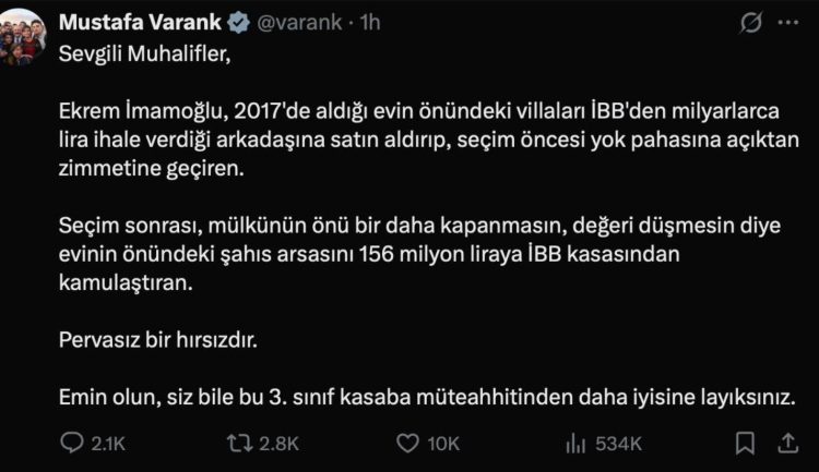 "Sevgili Muhalifler, Ekrem İmamoğlu, 2017'de aldığı evin önündeki villaları İBB'den milyarlarca lira ihale verdiği arkadaşına satın aldırıp, seçim öncesi yok pahasına açıktan zimmetine geçiren... Seçim sonrası, mülkünün önü bir daha kapanmasın, değeri düşmesin diye evinin önündeki şahıs arsasını 156 milyon liraya İBB kasasından kamulaştıran... Pervasız bir hırsızdır. Emin olun, siz bile bu 3. sınıf kasaba müteahhitinden daha iyisine layıksınız."
