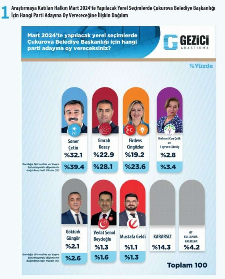 Gezici Araştırma Merkezi tarafından, yerel seçim öncesi anket çalışması yapıldı. Anket, Adana genelinde sosyal, ekonomik, politik ve kültürel konular ile ilgili seçmenin algısını belirlemek üzere 9-10 Mart 2024 tarihlerinde gerçekleştirildi.