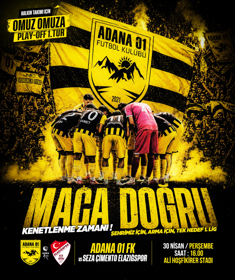 Türkiye Futbol Federasyonu’nun açıkladığı takvime göre Adana 01 FK, Play-Off 1. Tur ilk maçında 30 Nisan Perşembe günü sahasında Seza Çimento Elazığspor’u konuk edecek. Ali Hoşfikirer Stadyumu’nda oynanacak mücadele saat 16.00’da başlayacak. Rövanş ise 4 Mayıs Pazartesi günü Elazığ’da saat 20.00’de oynanacak.