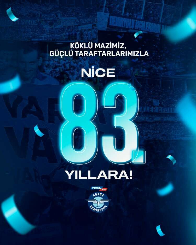 Adana'da 21 Aralık 1940 tarihinde dönemin Devlet Demiryolları 6. İşletme Müdürü Eşref Demirağ tarafından kurulan ve günümüzde TFF Trendyol Süper Lig'de mücadele eden Adana Demirspor A.Ş. 83 yaşında.
