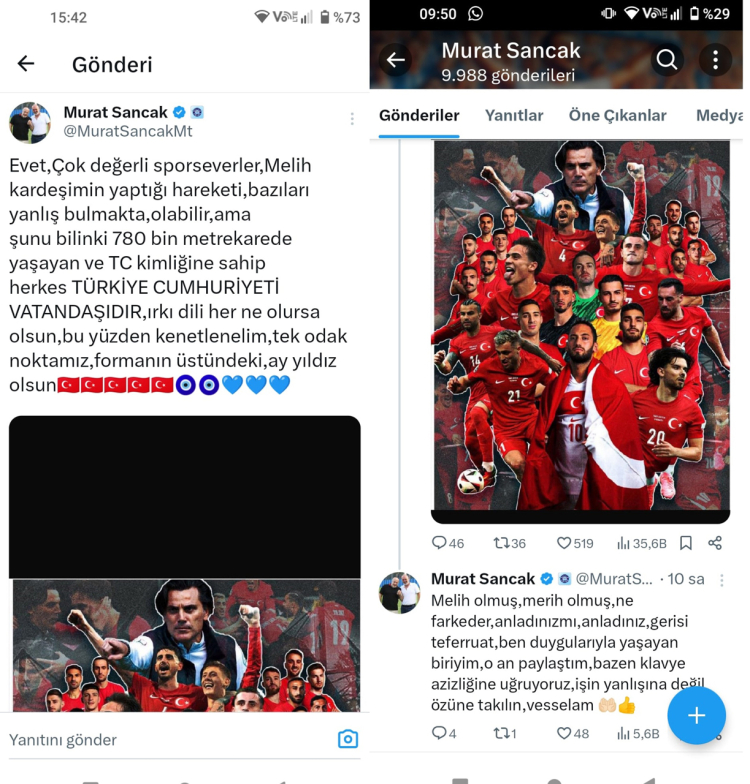 Murat Sancak, paylaşımında "Evet, çok değerli sporseverler. Melih kardeşimin yaptığı hareketi, bazıları yanlış bulmakta olabilir. Ama şunu bilin ki 780 bin metrekarede yaşayan ve T.C. kimliğine sahip herkes Türkiye Cumhuriyeti vatandaşıdır. Irkı, dili her ne olursa olsun, bu yüzden kenetlenelim, tek odak noktamız, formanın üstündeki, ay yıldız olsun." ifadeleri kullandı.