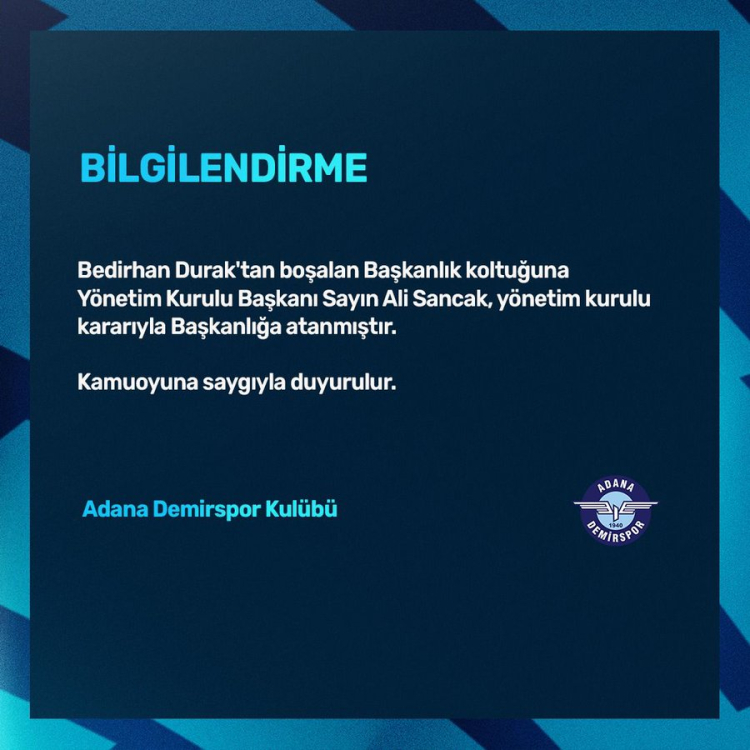 Adana Demirspor sosyal medya hesabından yaptığı açıklamada, “Bedirhan Durak’tan boşalan Başkanlık koltuğuna Yönetim Kurulu Başkanı Sayın Ali Sancak, yönetim kurulu kararıyla Başkanlığa atanmıştır. Kamuoyuna saygıyla duyurulur” ifadelerine yer verildi.