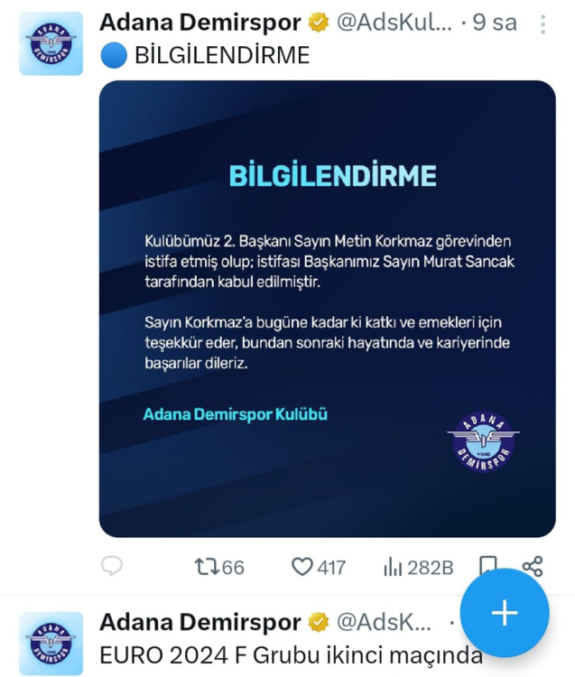 Adana Demirspor'un sosyal medya hesabından yapılan açıklamada, İkinci Başkan Metin Korkmaz'ın görevinden istifa ettiği bildirildi.