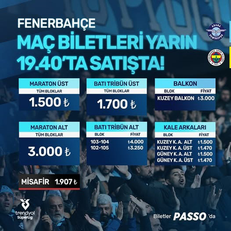 Adana Demirspor'un TFF Trendyol Süper Lig 20. haftasında Yeni Adana Stadyumu'nda 19 Ocak Pazar günü oynayacağı Fenerbahçe maçının biletleri bugün saat 19.40'ta satışa çıkıyor. Mavi-lacivertliler, kritik karşılaşmanın hazırlıklarına başladı.