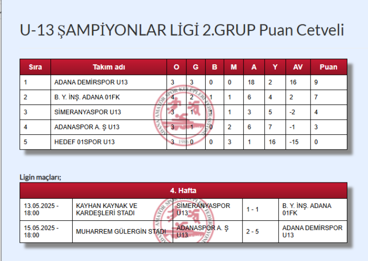 Süper Amatör Ligi, Şampiyonlar Ligi 2. Grupta yer alan Adana Demirspor U13 ekibi, ligin 4. Hafta maçında Adanaspor U13’ü 5-2 mağlup ederek 3 maçta 3. galibiyetini aldı ve zirvedeki yeri korudu.Adana Demirspor U13, ligin 4. Hafta maçında deplasmanda Adanaspor U13’ü 5-2 mağlup etti. Bu sonuçla çıktığı 3 maçta 3. galibiyetini alan mavi lacivertliler, puanını 9’a çıkararak zirvedeki yeri korudu.
