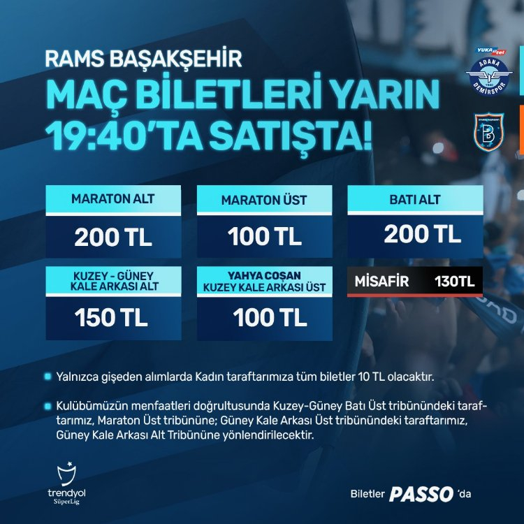 Türkiye Futbol Federasyonu (TFF) Trendyol Süper Lig takımlarından Adana Demirspor'un sezonun son haftasında konuk edeceği Rams Başakşehir maçının biletleri, bugün satışa çıkıyor.