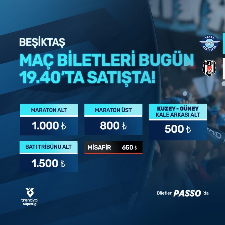 Bu arada Adana Demirspor'un Beşiktaş maçının bilet fiyatları da açıklandı. Buna göre, bilet fiyatları 1.500, 1.000, 800, 650 ve 500 TL olarak belirlendi.