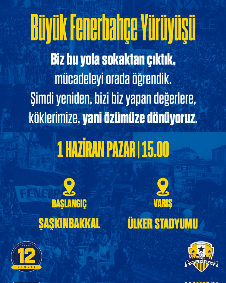 Fenerbahçe’nin 2024-2025 sezonunda şampiyonluğu Galatasaray’a kaptırmasının ardından taraftarlar tepkilerini sokağa taşıyor. Taraftar platformu 12 Numara ile UTG’nin ortak düzenleyeceği “Büyük Fenerbahçe Yürüyüşü”, 1 Haziran Pazar günü Şaşkınbakkal’dan başlayıp Şükrü Saracoğlu Stadyumu’nda sona erecek.