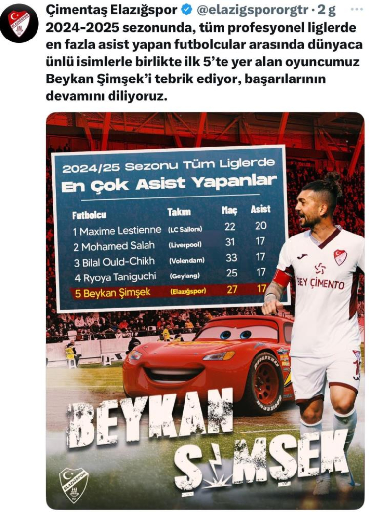 Elazığspor'un yıldız oyuncusu eski Fenerbahçeli Beykan Şimşek, 2024-2025 sezonunda yaptığı 17 asistle dünya genelinde en çok asist yapan futbolcular arasında Mohamed Salah ile birlikte ilk 5'e girdi. Takım oyununun önemine vurgu yapan Şimşek, kalan 4 maçta şampiyonluk hedeflediklerini belirtti.