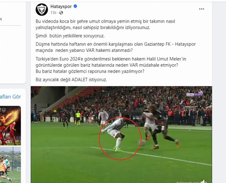 Yapılan paylaşımda, "Koca bir şehre umut olmaya yemin etmiş bir takımın nasıl yalnızlaştırıldığını, nasıl sahipsiz bırakıldığını izliyorsunuz. Şimdi bütün yetkililere soruyoruz. Düşme hattında haftanın en önemli karşılaşması olan Gaziantep FK-Hatayspor maçında neden yabancı VAR hakemi atanmadı? Türkiye’den Euro 2024’e gönderilmesi beklenen hakem Halil Umut Meler’in görüntülerde görülen bariz hatalarında neden VAR müdahale etmiyor? Bu bariz hatalar gözlemci raporuna neden yazılmıyor? Biz ayrıcalık değil adalet istiyoruz." ifadeleri yer aldı.