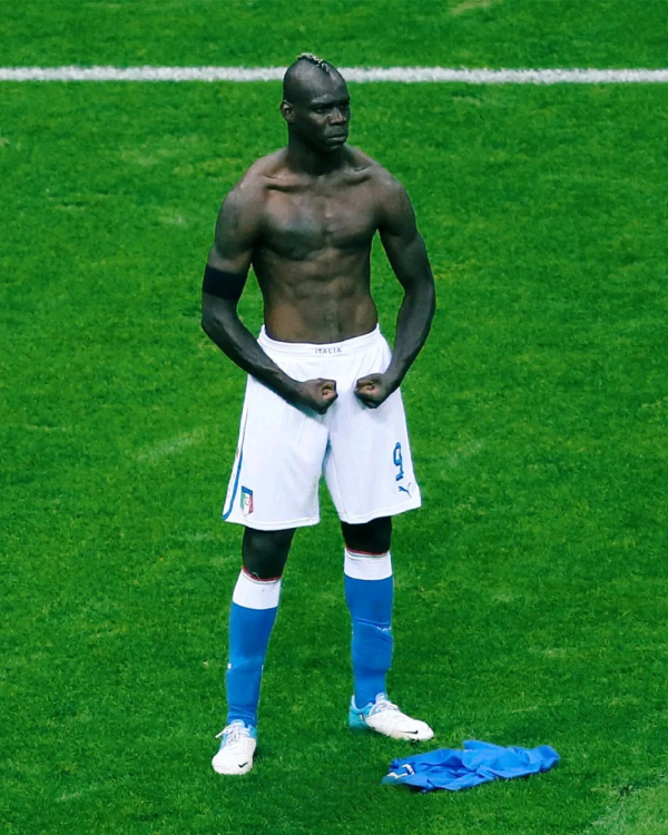 28 Haziran 2012 tarihinde oynanan 2012 Avrupa Şampiyonası Yarı Final maçında Almanya kalesine attığı 2 golle İtalyan futbol tarihine geçen ve bu maçtaki ikinci golünü de 90+1'de atıp ikonik gol sevinci yapan Mario Balotelli, o görüntülerin ardından savunma yaptı.