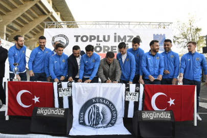 Kuşadası Belediye Başkanı Ömer Günel ile kulüp yöneticilerinin katıldığı toplu imza töreninden önce, kulübe bugüne kadar katkı yapan eski yöneticilere teşekkür plaketi takdim edildi. Ayrıca şampiyon olan U-14 takımına da kupa ve madalyaları Başkan Ömer Günel ile Kuşadasıspor Başkanı Ferdi Zenginoğlu tarafından verildi. Şenlik havasında geçen toplu imza töreni, Kuşadası Belediyesi’nin düzenlediği mangal partisiyle sona erdi.