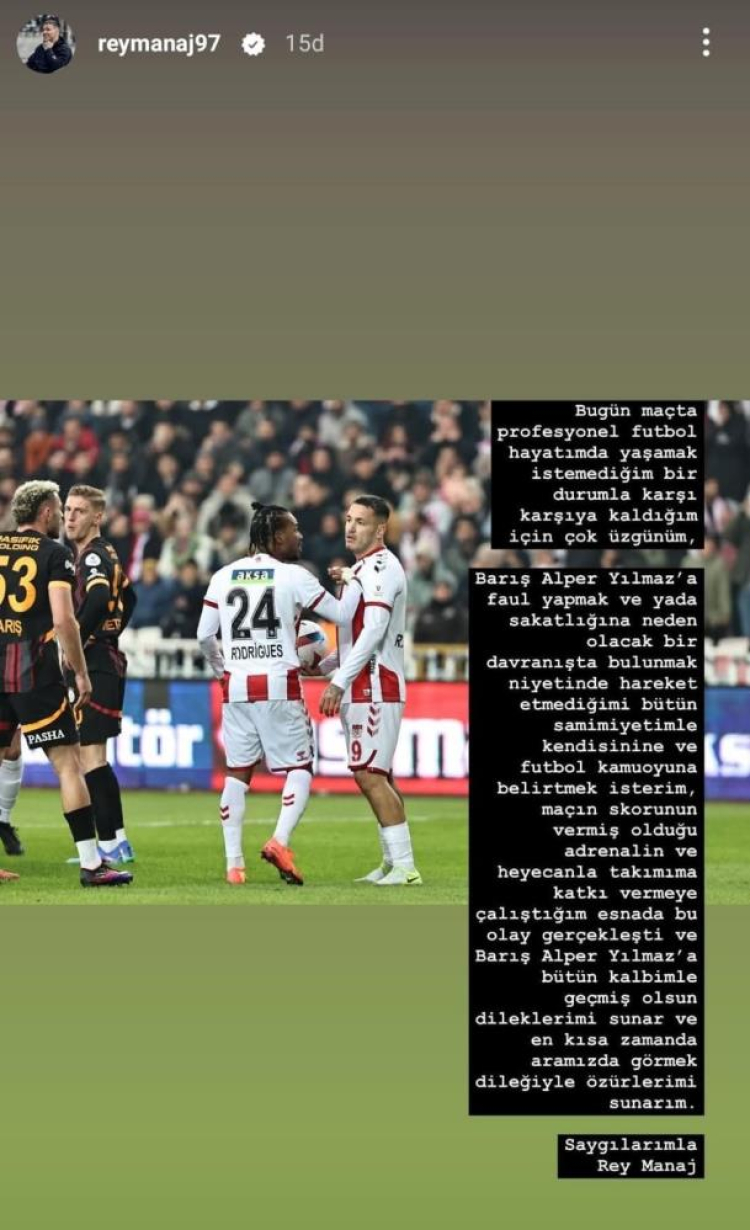Trendyol Süper Lig'in 15. haftasında Galatasaray, Sivasspor'u 3-2 mağlup ederken maçın son dakikalarında Rey Manaj'ın Barış Alper Yılmaz'a yaptığı sert faul, spor gündemine damga vurdu.Sivasspor'un golcüsü Rey Manaj, maç sonrası sosyal medya hesabından bir açıklama yaparak Barış Alper Yılmaz'dan özür diledi. Manaj, açıklamasında faulün kasti olmadığını ve adrenalinle hareket ettiğini belirtti.