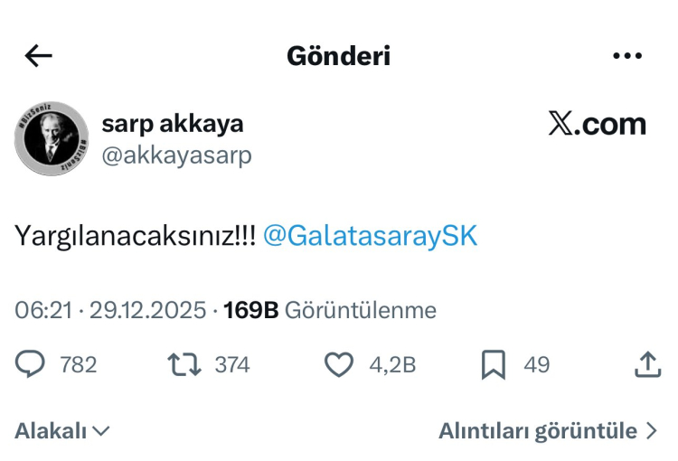Oyuncu Sarp Akkaya’nın Galatasaray’ı etiketleyerek yaptığı “Yargılanacaksınız!” paylaşımı, Galatasaraylı ve Fenerbahçeli taraftarları karşı karşıya getirdi.