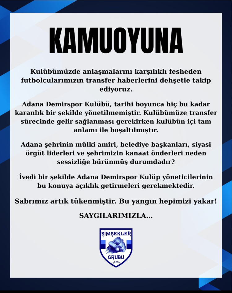 Adana Demirspor'un köklü taraftar grubu Şimşekler, kulüpte yaşanan transfer gelişmeleri ve yönetimsel duruma ilişkin sert bir açıklama yayınladı.