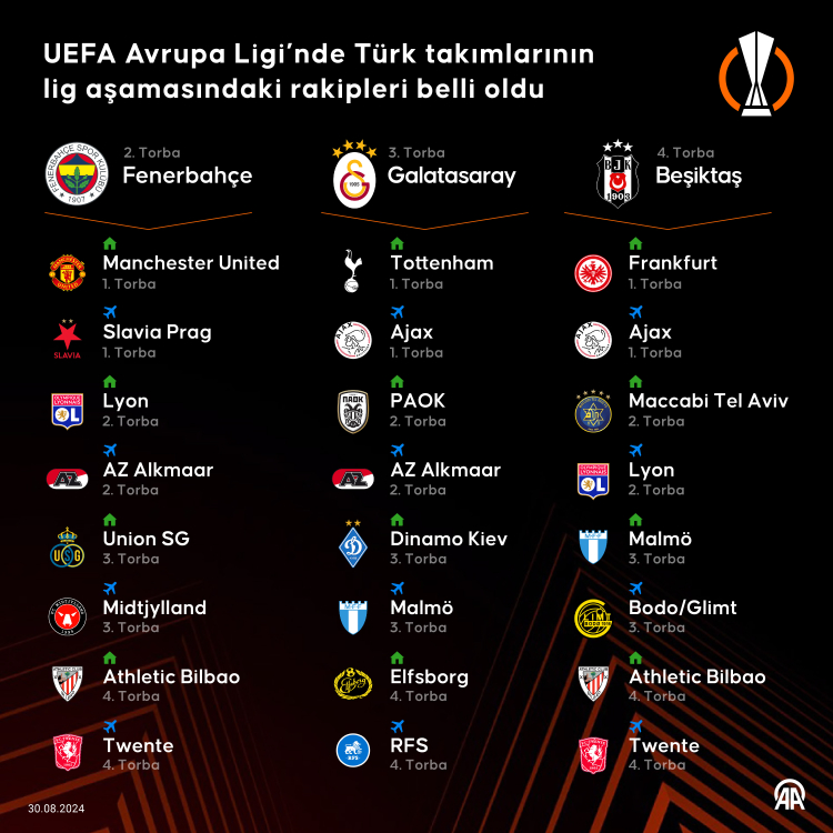 Galatasaray, Fenerbahçe ve Beşiktaş'ın 2024/2025 UEFA Avrupa Ligi'ndeki rakipleri belli oldu. Temsilcilerimiz, zorlu gruplarda Avrupa'nın dev kulüpleriyle karşılaşacak.