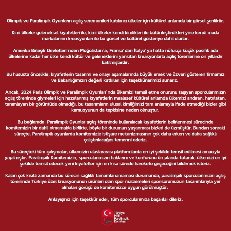 Türkiye Milli Paralimpik Komitesi (TMPK), Paris 2024 Olimpiyat Oyunları açılış töreninde milli sporcuların giyeceği kıyafetlerin yeniden tasarlanacağını açıkladı. Komite, sporcuların kültürel kimliklerini yansıtan yeni kıyafetlerin en kısa sürede hazırlanacağını belirtti. Ayrıca, sponsorun tasarımlarıyla Türkiye özel kreasyonunun ürünlerinin kullanılmasının da düşünüldüğü ifade edildi.