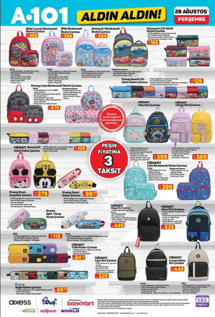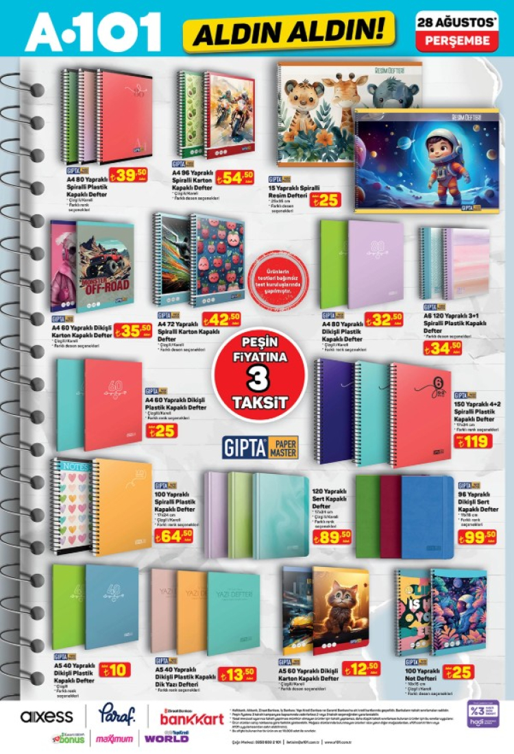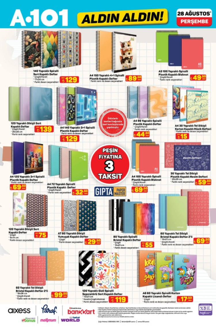 28 Ağustos A101 aktüel kataloğunda defter, kalem, silgi, kalem kutusu, okul çantası, kutu boyalar gibi kırtasiye malzemeleri öne çıkıyor. Yeni eğitim öğretim yılı öncesinde veliler, öğrencilerin ihtiyaçlarını bu ürünlerle karşılayabilecek.